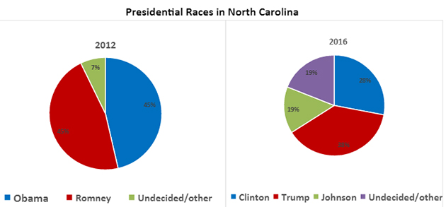 As the 2016 voting starts (mail absentee ballots are already being requested), it is illustrative to look at opinions among unaffiliated voters this year to get a sense of which way these voters are leaning and compare to where they were in 2012 at the same time. The big difference is the rapid growth of unaffiliated voters in North Carolina. According to