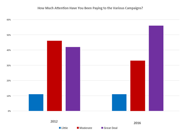 It appears that Republicans up and down the ticket have the advantage with unaffiliated voters as of this poll. Another indicator as to how this data will hold up is the question we ask as to "how much attention have you been paying to the various campaigns so far?" These voters are much more aware of this year's election than they were in 2012.