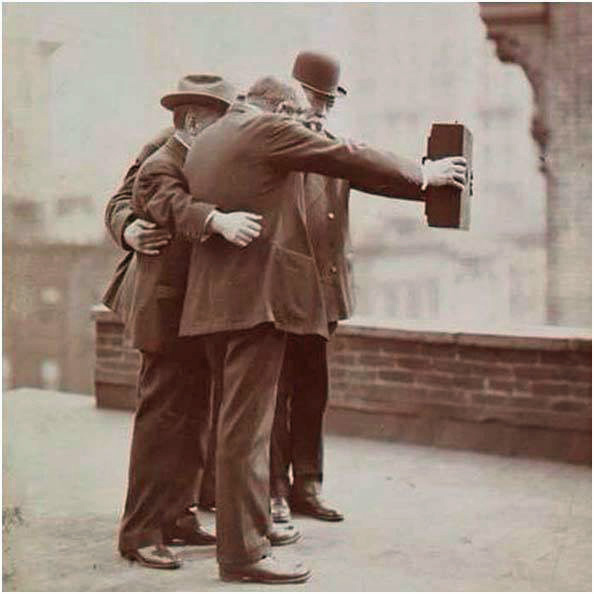 Selfies are not a recent trend. As long as people have been able to see their reflection in a pool of water, I suspect they were planning on how to take that ultimate selfie. Below is early evidence of four men perfecting the technique. Apparently, there was a fifth guy there to record the event.