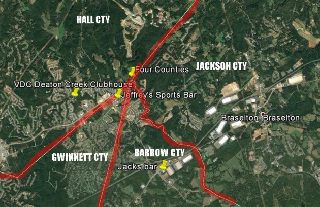 Just half a mile from me is the intersection of four counties where you can do the same thing. Hall, Gwinnett, Barrow and Jackson counties all converge on one point. Back in my drinking days I passed through all four on my way home from Jacks or Jeffrey's bar. I do not recall a plaque at this intersection in the woods. Does that make me an explorer? You can look it up. Now that I do not partake, I only pass through three of the four counties since one is just a hundred yards or so off course.