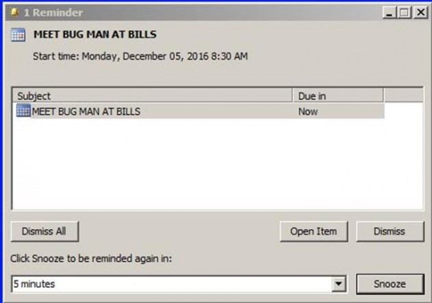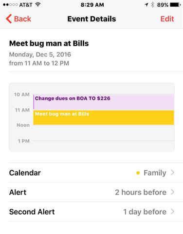 I just received his text message reminding me that the "BUG MAN" is coming at 11:00 AM this morning. I think the problem is that I have too many places to put my reminder notes, but I could be wrong. Some of those things update from the cloud and I probably could have just gone outside and looked up to see the reminder.