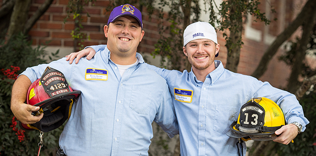 Grounds worker Kevin Byrum and equipment operator Chris Wilson balance working at ECU with family and volunteering at local fire departments in Pitt County. Both have experience responding to emergencies and natural disasters like Hurricane Matthew in eastern North Carolina.