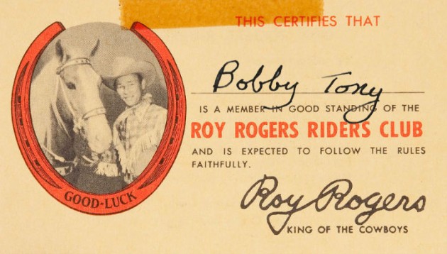 Cowboys of the Fifties. )I think one of my first brushes with wiretapping was on Euclid Avenue in Little Five Points somewhere in the vicinity of 1955. I do not remember the exact date but I am pretty sure it was on a Saturday morning. There were two movie theaters in L5P. One played the westerns matinee, which was a sort of cowboy soap opera. We did not have a TV in 1955 so I did not know what a soap opera was then. The Saturday Morning Matinee featured, Red Ryder, Rocky Lane or Wild Bill Elliott, but the real draw was the Roy Rogers Riders Club. The club issued membership cards and had a set of rules. The other theater played the Adult Westerns of Randolph Scott and Joel McCrea. I no longer have my membership card but I found a copy on the internet and now have it framed in my Man Cave.