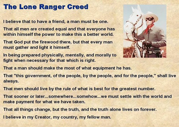 By the way the Lone Ranger also had a creed that today would be so unreasonable that it would be considered laughable. After careful review, I did not see any ban on Wiretapping or intercepting smoke signals, so I guess that was okay back then.