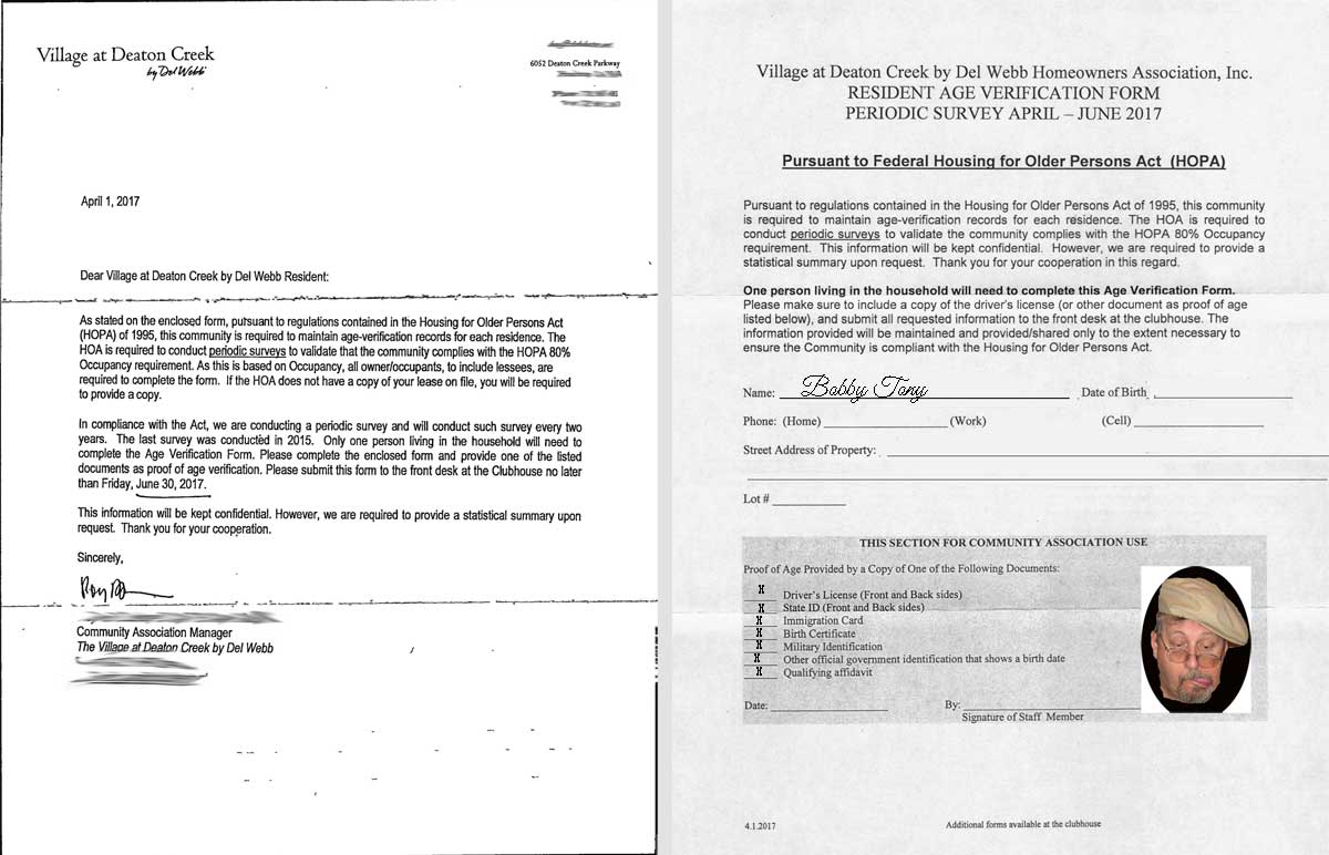 Why is this important you ask? Or do you? Well, Every two years I have to appear before a duly authorized representative of our neighborhood HOA and present my affidavit. I also must show them my ID to prove that I am old enough to live in this COMMUNITY. Below is the letter and affidavit that is required to stay on good terms with Uncle Sam and his enforcers.