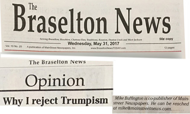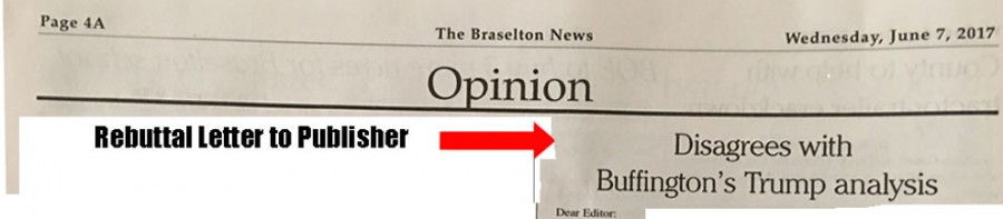 I receive a copy of the weekly paper Braselton News every Thursday. It is an unsolicited and unpaid publication with local news and obituaries as well as some local articles. Within the last few months the paper was purchased by another company. The co-publisher is not a big Trump Supporter. As a matter of fact he is an ardent non supporter. Most of his editorials are not related to the local community but his brand of politics. That is his right as the publisher and I have no problem with that. A recent editorial by him explained why is he not on the Trump Bandwagon.