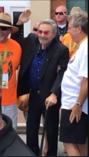 Like all old memories, the images we have in our mind exist frozen at the time we made that memory. But time waits for no man and as we are confronted with the reality of what it has done to we soon realize that it is not the movie we remember cherish the most, but our youth at the time of its occurrence. If you are fortunate, you may have a chance to go back to your 50th High School reunion, but it won't take long to realize that your mind has never really adjusted to the passage of time until you see that everyone is so old they don't recognize you. In your mind's eye you look and feel the same as you did then but they all have aged beyond what you expected. Please excuse the quality of the picture, it is not a publicity photo but a picture from a fan in the crowd. Click here for a short video of Burt waving to the crowd last weekend.