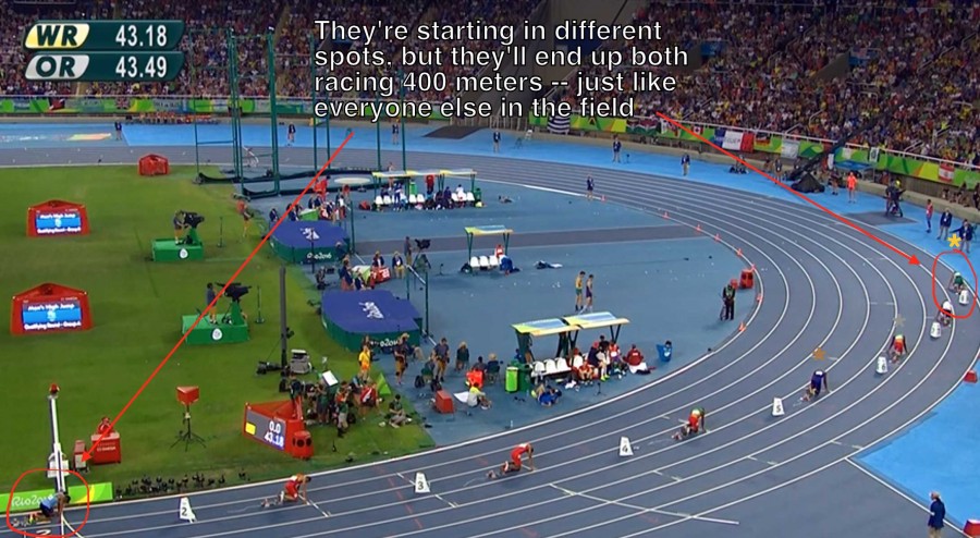 I think we can all agree that in the example of the hurdle race all the hurdles should be equal and the distance the same for all. If we took a picture of the starting line in a 400 meter race it would be obvious that the deck is stacked. Some of the runners are starting ahead of the others. Obviously that is not fair. But if you look at the race track you quickly find it is an oblong track which means the inside track is shorter than the outside track. In the end all the racers run the same 400 meters.