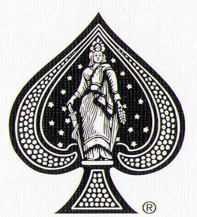 The Ace of Spades carries another code, identifying the year in which the deck was printed. This Ace features, within the suit sign, a woman who rests her right hand on a sword and shield while she holds an olive branch in her left. The image was inspired by Thomas Crawford's sculpture, "Statue of Freedom." which, in 1865, had been placed atop the Capitol Building in Washington, DC.