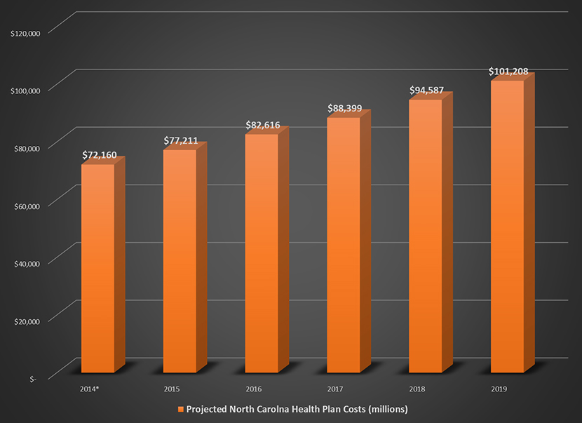 Beginning in 2014 with the reported $72.16 billion in total North Carolina healthcare expenditures and applying an average growth of 7% per year, the potential cost for the first year (2019) of the North Carolina Health Plan is $101.2 billion!