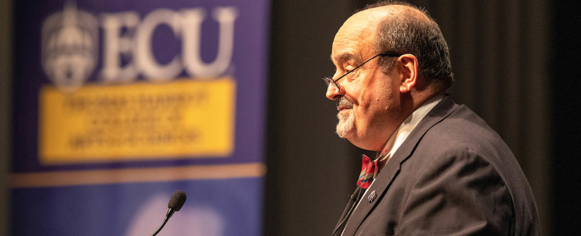 Angus Konstam, author, historian and pirate expert, spoke to an audience in ECU’s Wright Auditorium on Oct. 25 for the kick-off event in the 2018-19 Voyages of Discovery Series. (Photos by Cliff Hollis)