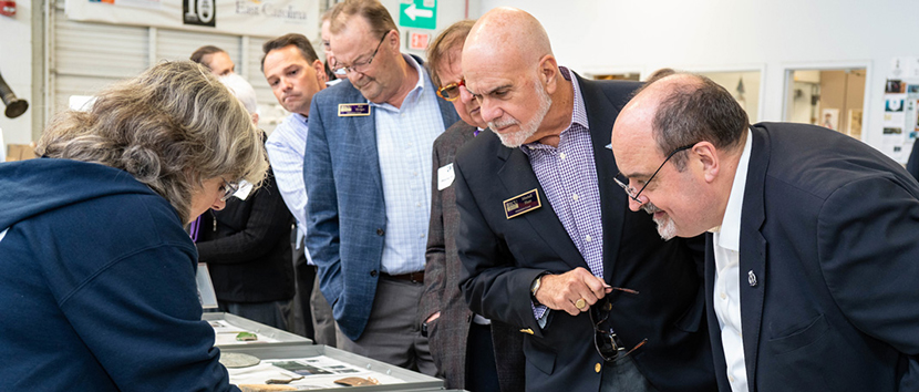 Angus Konstam (right) looks on as Sarah Watkins-Kenney (left), from the QAR lab, describes artifacts retrieved from the Queen Anne’s Revenge. Also pictured (left to right) are ECU chemistry professor Jack Pender, and THCAS Dean’s Advancement Council members Phil Hodges, Wayne Holloman and Mitchell Hunt.