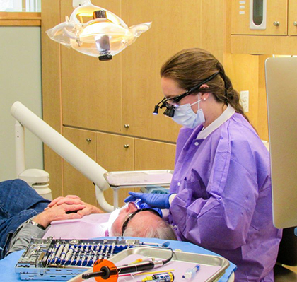 Fourth-year ECU dental student Raven Corbett provides oral health care to a veteran during the inaugural ECU Smiles for Veterans event Nov. 15 at the School of Dental Medicine’s CSLC–Sylva. (Photo by Spaine Stephens)