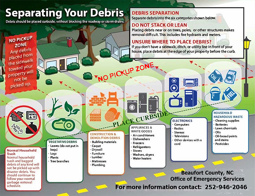 Vegetative debris, construction and demolition debris, appliances, white good debris, electronics and household hazardous waste will be removed from state-maintained right of ways throughout unincorporated Beaufort County. Residents should ensure that all debris is stacked within the right of way, but well off the road to not impede traffic or create unsafe driving conditions. Storm debris must be divided into separate piles with each pile clear of electrical lines (do not stack debris under electric lines), water meters, hydrants, and mailboxes. Failure to divide debris into separate stacks or placing debris to close to power lines and mailboxes could impede debris pick-up. Please do not put storm debris in trash bags.