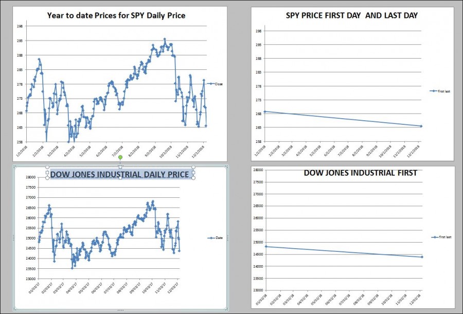 When I have a tendency to over react to the daily fluctuations in the market I use my trusty old Excel Chart to smooth out the dips and valleys. As you can see below, the charts on the left show the daily fluctuations in the Dow Jones and S&P 500 closing. The Charts on the right use the same numbers but only show the first and last (Jan 1- Dec 7). The start and end are the same for both charts, but the thrill seekers can pay their nickel and enjoy the ride. The rest of us can stay on the bench and wait for the first car to come back into the station.