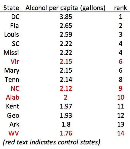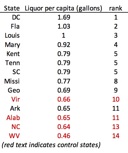 As you can see, the states controlling retail sales of liquor have among the lowest per-capita consumption of liquor of the 14 states in the region. North Carolina is 13th out of 14.