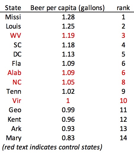 See, for example, how the liquor control states fare in terms of beer consumption per capita. Suddenly they're in the middle of the pack, with one (West Virginia) ranking third overall. North Carolina ranks 8th out of 14 in that measure - suddenly in the middle of the pack.