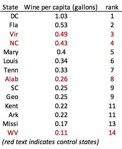 The other shoe drops when looking at wine sales per-capita. Two liquor control states round out the top four, Virginia (3rd) and also North Carolina (4th).