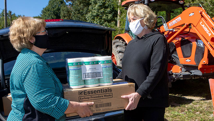 Dr. Robin Tutor Marcom, director of the North Carolina Agromedicine Institute hands protective masks and disinfectant wipes to Tracy Taylor, owner of Stone Mountain Farms in Vilas, N.C. | Photos: Marie Freeman / Appalachian State University