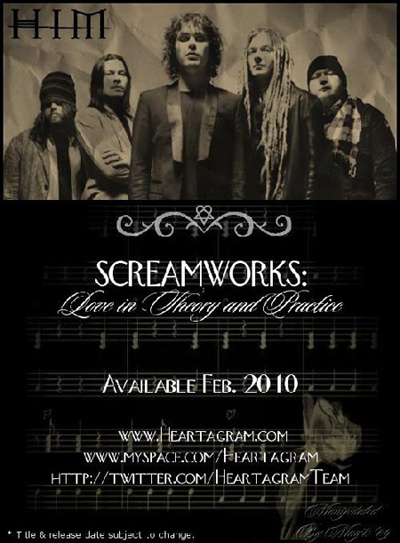 The Finnish rock band known as HIM has returned with its seventh studio album, "Screamworks: Love in Theory and Practice". The five musicians from Helsinki, Finland have started off the new decade with another sonic surprise of a rock album. This album is filled with heavy, goth-tinged, guitar-driven rock tunes that beckon the music-world to relish, savor and urge them to attribute this work to their precious rock and roll compilations. As an observer and listener of HIM's previous albums, the band's February 9, 2010 release is by far the most aggressive in terms of its lyrical positivity and musical dynamics. Unlike the past more melancholic albums; it portrays love in a more optimistic light, which literally "screams" out for hope, redemption, and (as always) love. As singer Ville Valo has previously stated in an interview; it's about "embracing the light at the end of the tunnel" and he describes the quality of the songs as, "heavy, but a lighter shade of black." (video- "Ville Valo Talks About Screamworks", HIM's Youtube channel ).