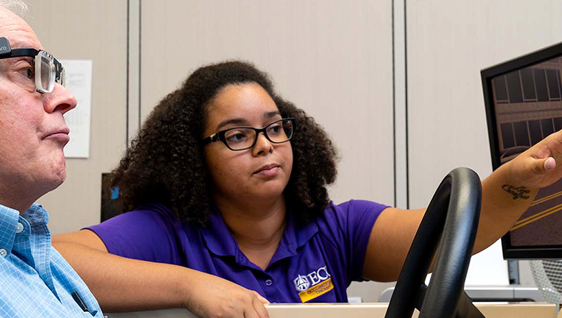 An ECU occupational therapy student works with a participant in the driving simulator in the College of Allied Health Sciences in 2018. | Photo: Cliff Hollis