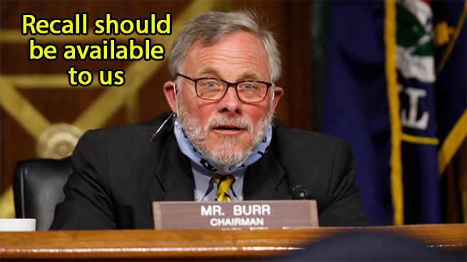 The states should immediately launch a process to amend the U. S. Constitution, and in North Carolina the State Legislature should do the same for the N. C. Constitution, to provide for recall of U. S. Representatives and Senators. This is particularly true for the U. S. Senate.