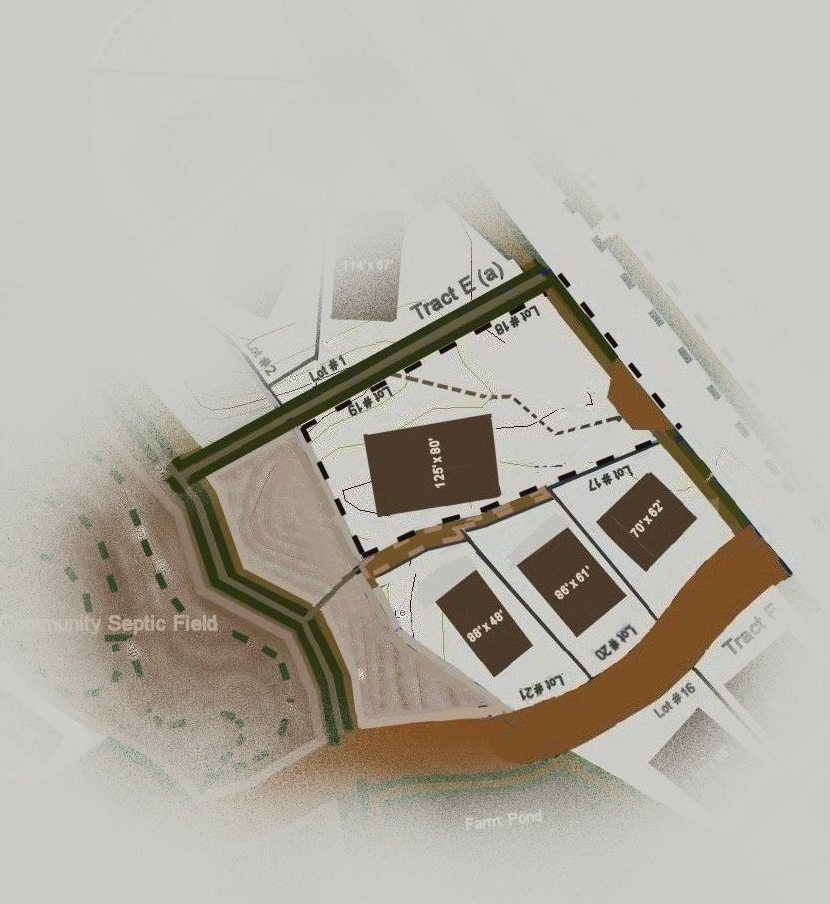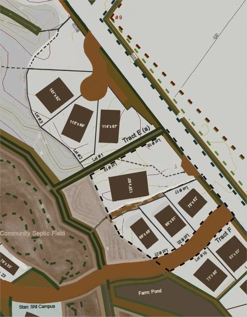 A picture into the proposal of part Tract F: One larger tract of combined lots, with adjoining lots of the aforementioned tract, along the southside Right of Way of Old Blounts Creek Road, near the southern center of the project. (look for the focused space): Above. map by Stan Deatherage Click map to expand. Click here to access the map of the entire proposed Calf Creek Preserve. All maps by Stan Deatherage show notes that are inconsequential as a sales tool, and serve to relate intentions or facts to other professionals.