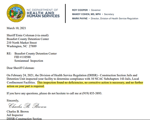 The state conducted its required semi-annual inspection of the Beaufort County Jail on February 24, 2021. You can review the transmittal letter and the inspection report at the links below.