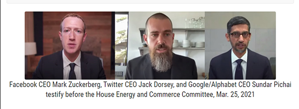 As I noted when I reported last month on the scheduling of this hearing, this was “the third time in less than five months that the U.S. Congress has summoned the CEOs of social media companies to appear before them with the explicit intent to pressure and coerce them to censor more content from their platforms.” The bulk of Thursday’s lengthy hearing consisted of one Democratic member after the next complaining that Facebook CEO Mark Zuckerberg, Google/Alphabet CEO Sundar Pichai and Twitter CEO Jack Dorsey have failed in their duties to censor political voices and ideological content that these elected officials regard as adversarial or harmful, accompanied by threats that legislative punishment (including possible revocation of Section 230 immunity) is imminent in order to force compliance (Section 230 is the provision of the 1996 Communications Decency Act that shields internet companies from liability for content posted by their users).