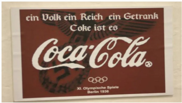 Did you know that Nazi Germany was one of Coca-Cola’s biggest markets? Have you ever seen an official Coca-Cola advertisement promoting the company’s partnership with the Nazis during the 1936 Olympics under a jingoistic tagline — “One people, one country, one drink, Coke is it” — that would have made Adolf Hitler proud? No?