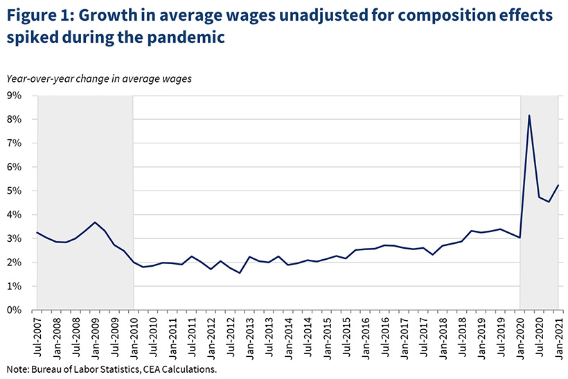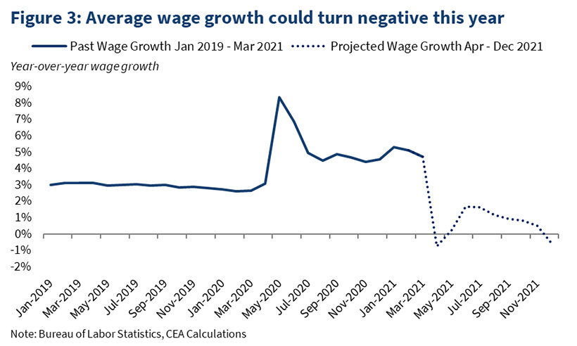CEA blogpost). Whereas wage base effects will dampen measured growth in average wages, price base effects are likely to cause temporarily higher inflation estimates. Prices were suppressed when the pandemic hit, and measured inflation had been weak since. But now because of the weak spring 2020 price levels (and other factors discussed in the previous blogpost), measured year-over-year inflation has increased. Given all these factors, it is possible that reported real average wages could fall faster than we've seen before.