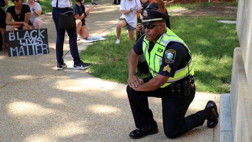 A State Capitol Police officer kneels at a protest June 2 on the Old Capitol grounds in Raleigh. | Photo: Don Carrington / Carolina Journal
