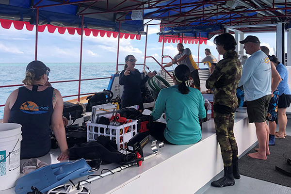 McKinnon briefs the team before diving during a trip to Saipan in 2019. | Photo: Caleb Brewer