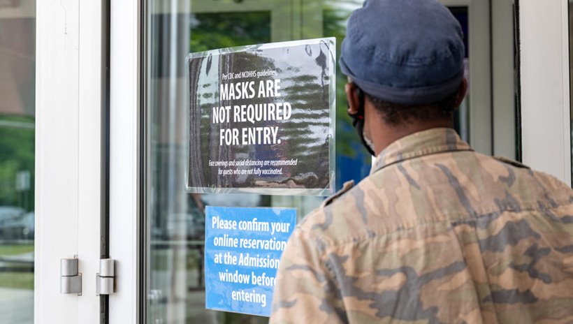 Man reads mask sign posted on Raleigh store. | Photo: Maya Reagan / Carolina Journal