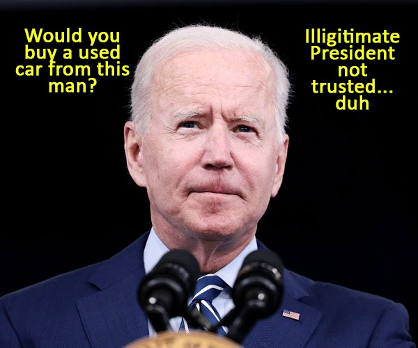 It is not just Biden that has a trust issue, it is also IMO about 99% of the federal government from the FDA (federal death agency) to the CDC (center for diseased cockroaches) and everything in between and on either side. Then there is the issue of big pharma and trust. What was it they declared that their injections were 90+% effective in preventing people from getting c-19. We know now it does not prevent people from getting c-19. Well the injections have been 100% effective in those that the injections killed, those folk will never get c-19. Then there is the issue of safety, which they insisted on total immunity from any damage these injections do now or in the future. Where are the animal studies? The lab rats seem to be the humans this go round. Safe, not for everyone according to what has been reported on VAERS. openvaers.com
