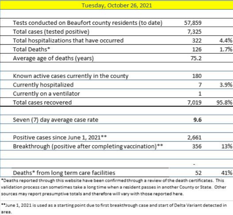 7 new cases have been reported in Beaufort County since yesterday (10/25).