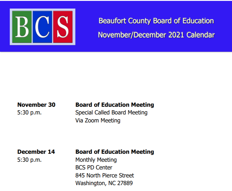 Included within this announcement is the calendar for the Beaufort County Board of Education for November-December 2021