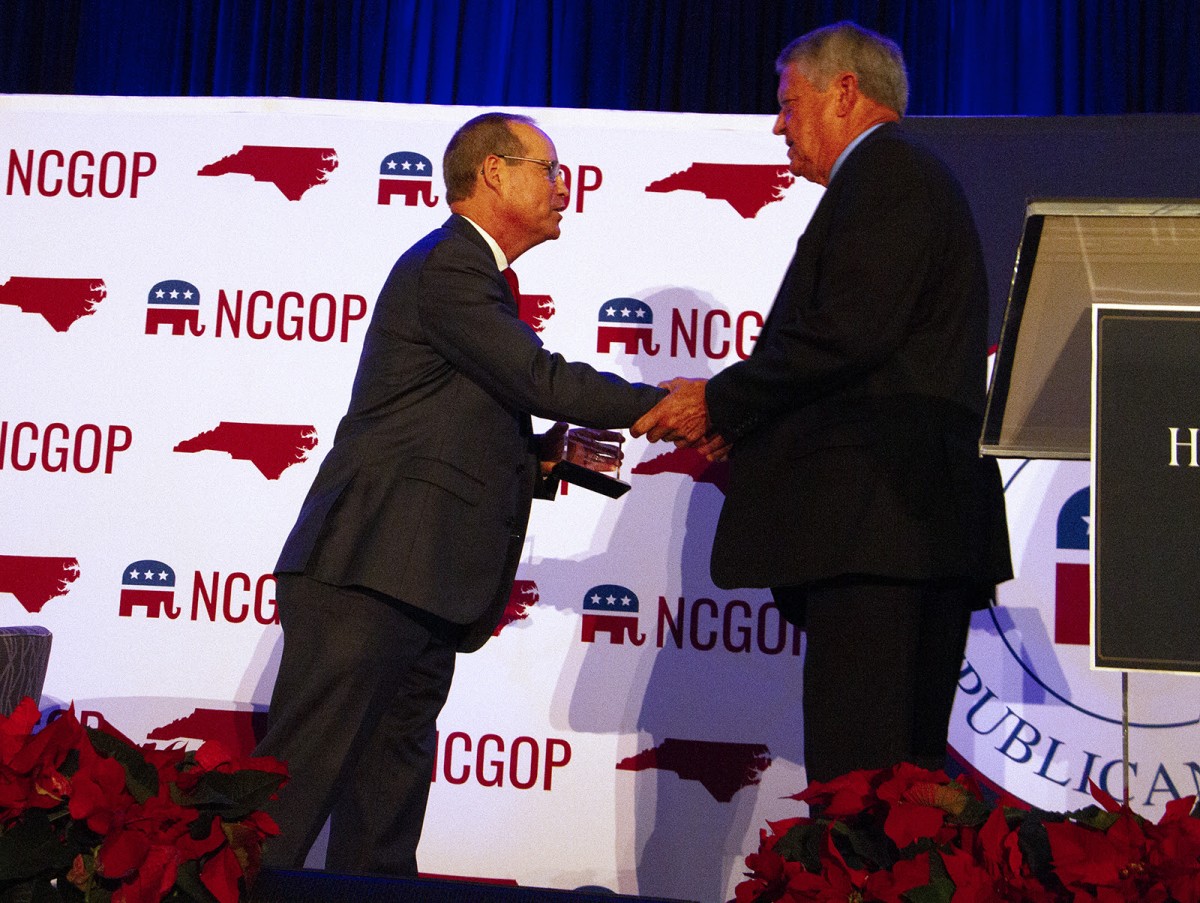 Congressman Greg Murphy (NC-3), left, presents State Senator Norman W. Sanderson (R-District 2), right, with the N.C. Republican Party Hall of Fame plaque during a celebration banquet in Raleigh, N.C., Saturday, December 4, 2021.