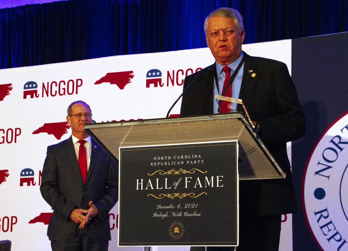 State Senator Norman W. Sanderson (R-District 2) addresses those in attendance at the N.C. Republican Party awards banquet in Raleigh, N.C., held Saturday, December 4, 2021, after receiving a plaque for being inducted into the North Carolina Republican Party Hall of Fame from Congressman Greg Murphy (NC-3), left.