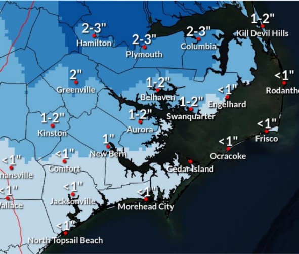 This morning’s update included minor adjustments to snow accumulations, with Beaufort County forecasted to receive between 8 and 12 inches.