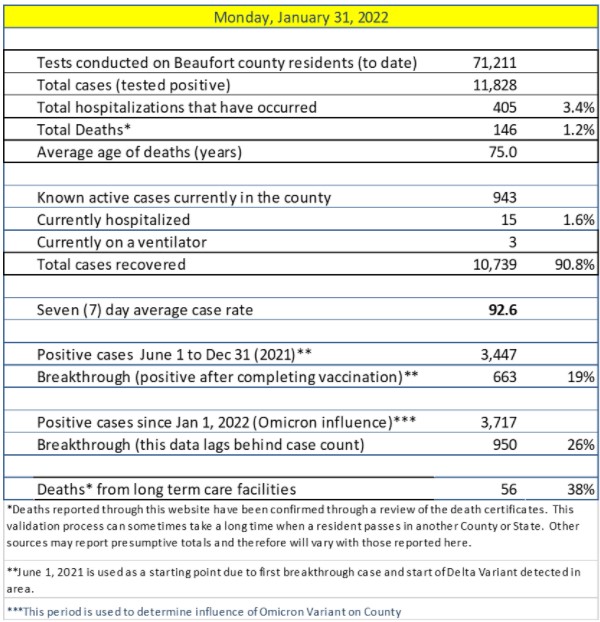 228 new cases have been reported in Beaufort County since Friday (1/28).