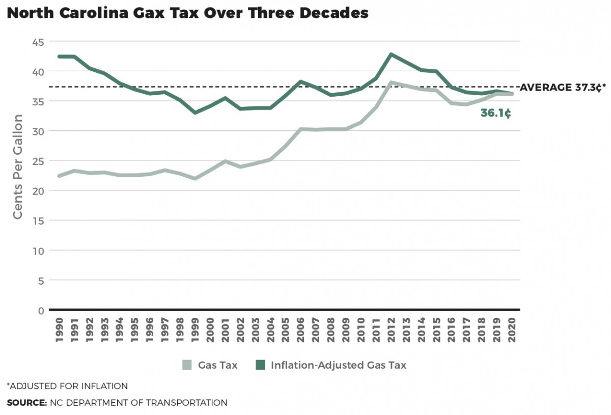 During the pandemic, the North Carolina General Assembly froze the gas tax rate at 36.1 cents per gallon. That has since been lifted. The state's gas tax for 2022 is 38.5 cents per gallon.