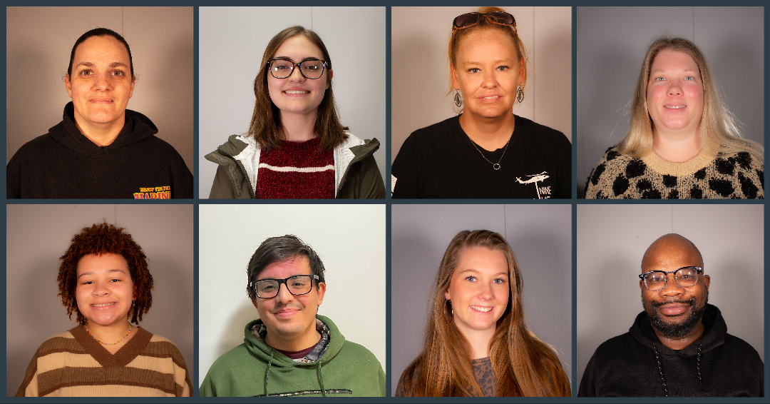 Cutline: (Top, left to right) Mara Jones, Megan Huettmann, Erin Mizell, and Stephanie Stepps. (Bottom, left to right) Rylee Midyette, Savea Brinegar, Pedro Martinez Pantoja, and Anthony Etheridge.