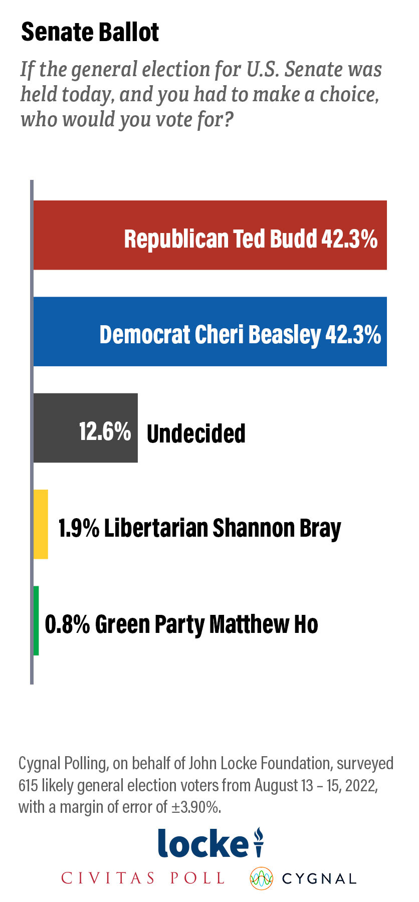RALEIGH The race is tightening for candidates across the board in North Carolina's November election, according to the latest Civitas Poll, released by the John Locke Foundation. The August poll of likely North Carolina voters puts the leading U.S. Senate candidates, Republican Ted Budd and Democrat Cheri Beasley, at an exact tie. Both garnered 42.3% of voters' support, though, 12.6% of North Carolinians remain undecided. Another 2.7% support Libertarian and Green Party candidates.