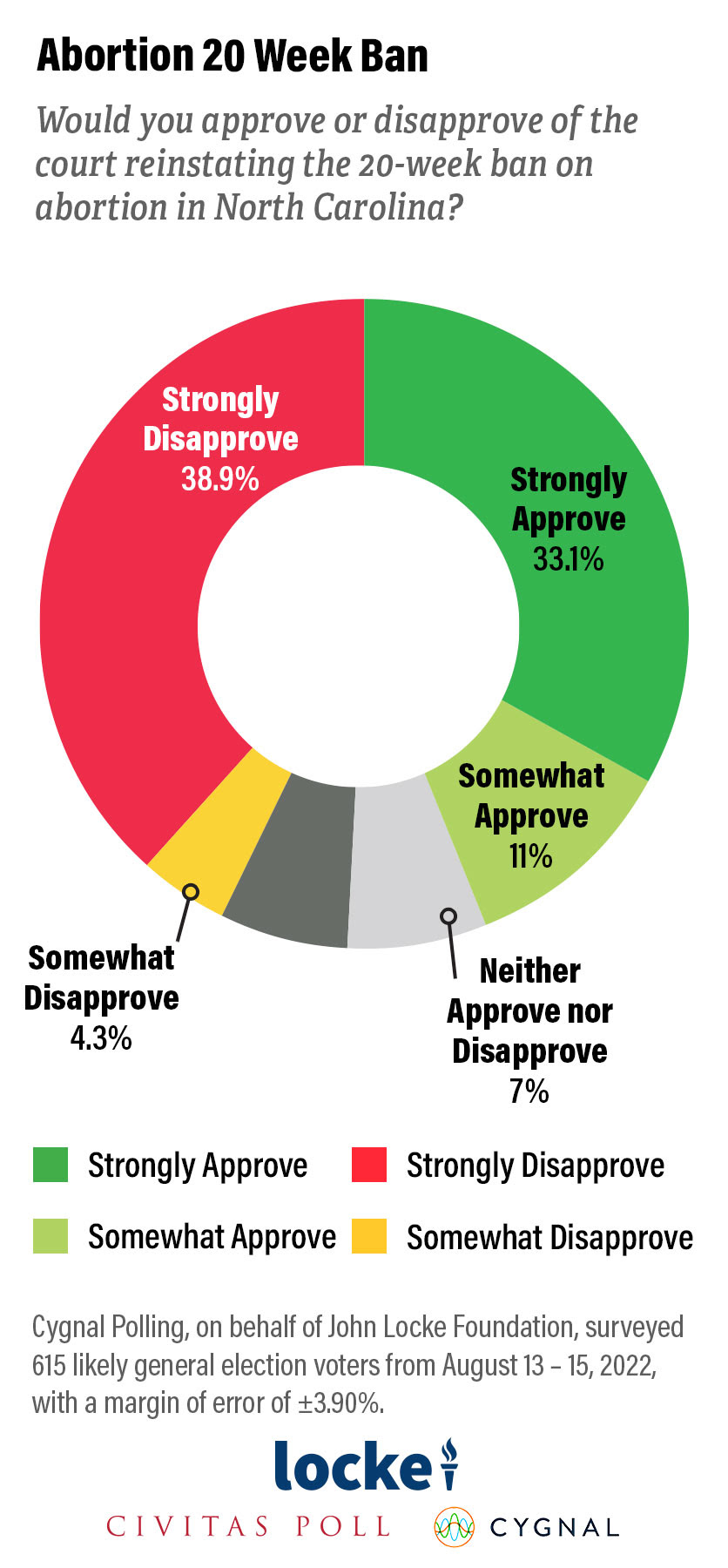 "to consider using Medicaid to pay for expenses for those who cross state lines to seek abortions." However, 50.3% disapproved of that executive order to potentially allow Medicaid dollars to be used to pay for out-of-state abortions. When it comes to North Carolina law, the state is divided on the state's 1973 abortion law. Forty-four percent of participants approved of reinstating the 20-week abortion ban, while 42.6% disapproved - a difference within the poll's 3.9% margin of error.