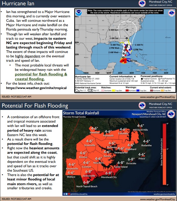 As previously mentioned, there continues to be subtle differences between the forecast models so far, which drastically change the forecasted impacts for Beaufort County. For example. The ECMWF (Euro) suggests a more inland track for impacts from Florida through the Eastern US, keeping most of the rain south and west of our area. However, the GFS suggests a more eastern track for impacts, bringing more rain and wind to us. We are hopeful that many of the differences seen between forecast models will be resolved today, as Ian moves over Cuba and begins to interact with some of weather variables that have been forecasted to steer and / or cause Ian to gain / loss strength. With all this being said, it is important that we continue to monitor the progression of Ian over the coming days. Please use this time to ensure that you, your family, friends and neighbors are prepared for any possible impacts that may come our way, especially heavy rains, persistently high winds, power outages, etc..