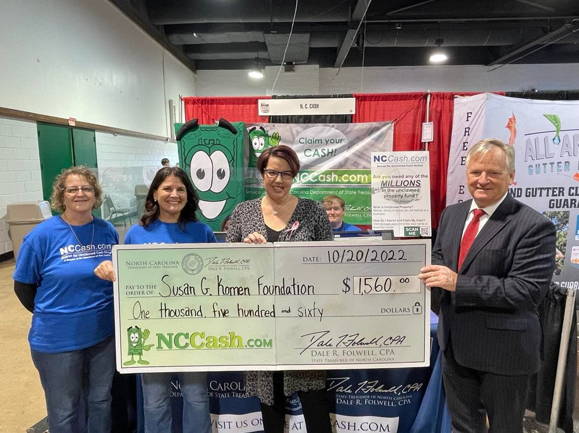 (Raleigh, N.C.)     State Treasurer Dale R. Folwell, CPA, praised the efforts of the Susan G. Komen Foundation to combat breast cancer and returned missing money from the Department of State Treasurer's (DST) Unclaimed Property Division (UPD) to the charity during an event at the N.C. State Fair today.