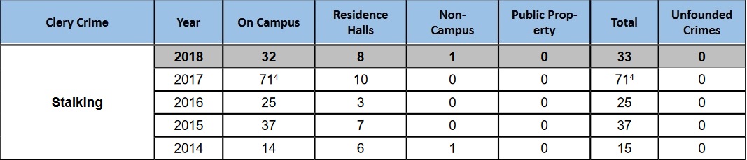 Nevertheless, the aforementioned exceptions are worth noting, if only because they reveal the inherent arbitrariness of the Clery Act system. As the following excerpt from UNC-Chapel Hill's 2019 report reveals, the number of stalking incidents experienced by Chapel Hill students nearly tripled between 2016 and 2017.