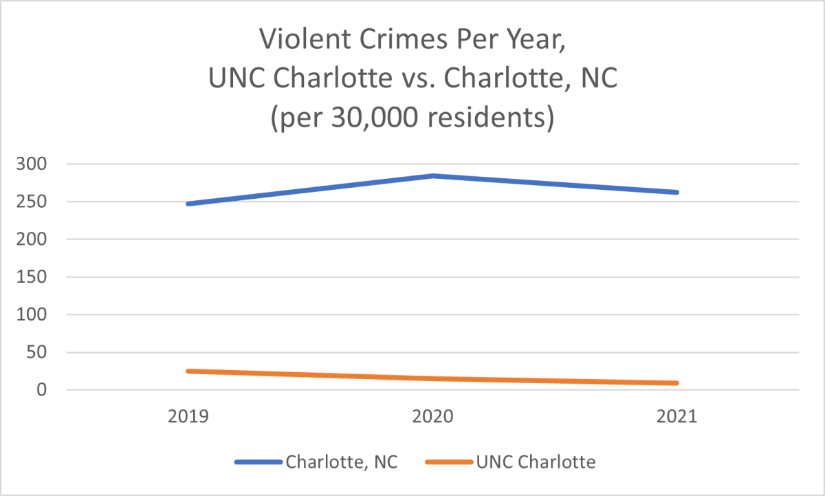 This method of tabulation is obviously imperfect. For one thing, communities and campuses have differing and overlapping populations. (In the case of our UNC Charlotte vs. Charlotte, NC, comparison, we have attempted to correct for the population disparity.) For another, the FBI's crime numbers are self-reported by individual police and sheriff's departments with little oversight. (Did Jackson County really have only 11 violent crimes in all of 2021?) Still, a clear picture emerges. On the whole, college campuses experience less crime-often far less crime-than the surrounding locales. That this is true at the flagship university, on an urban campus, and on a rural one merely illustrates the point.