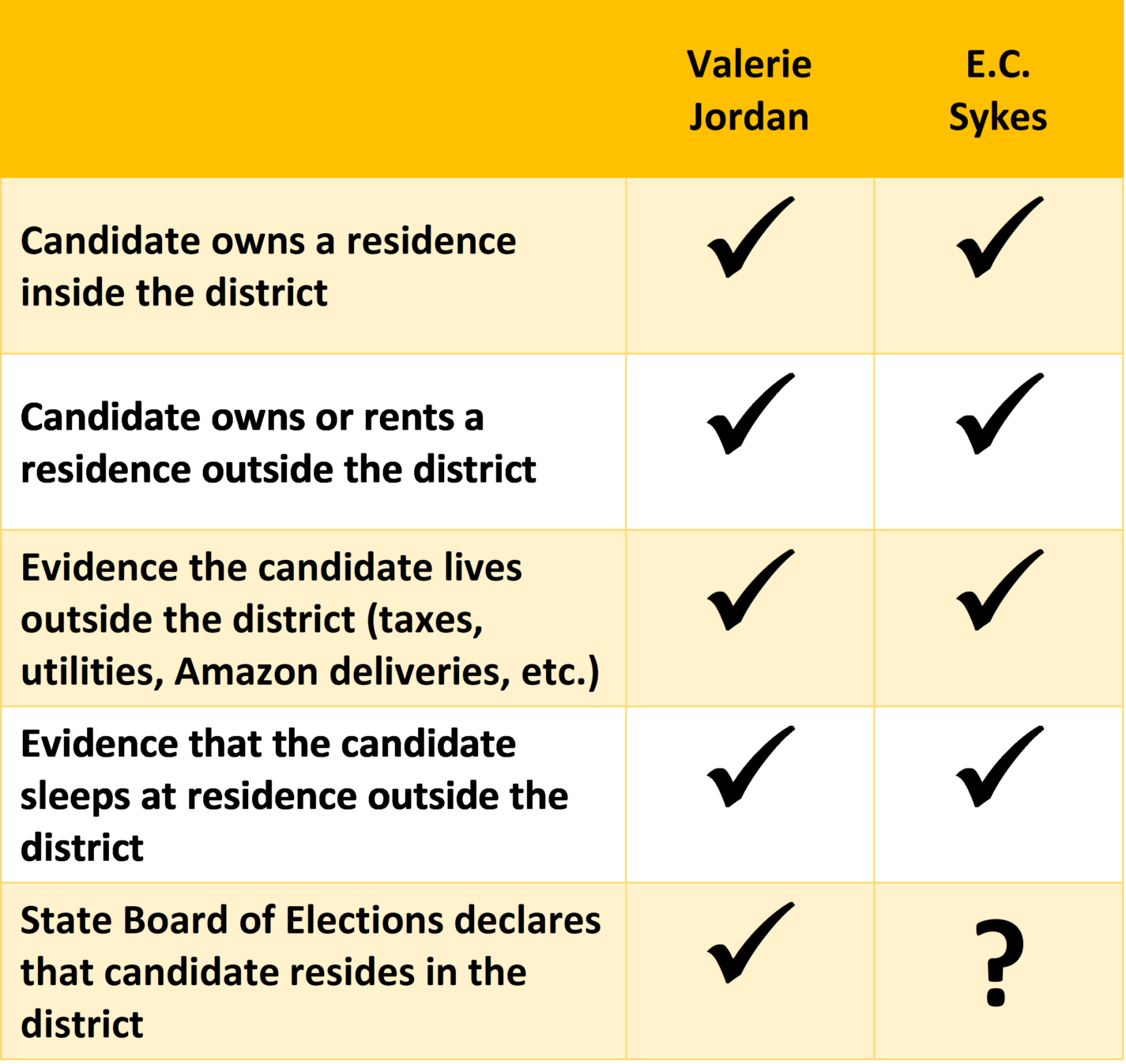 The evidence would seem pretty convincing, except for what happened in a similar case last summer. A complaint against North Carolina Senate Candidate Valarie Jordan included evidence indicating that she actually resided in Raleigh, which would have put her well outside the Senate district she was running for in northeastern North Carolina. Despite that evidence, the SBE decided on a party-line vote to not replace her on the ballot.